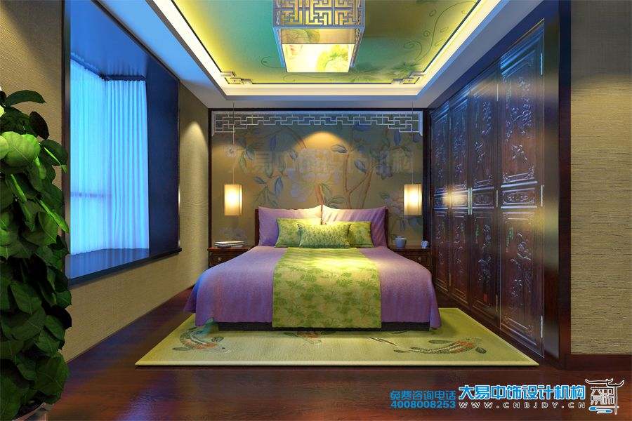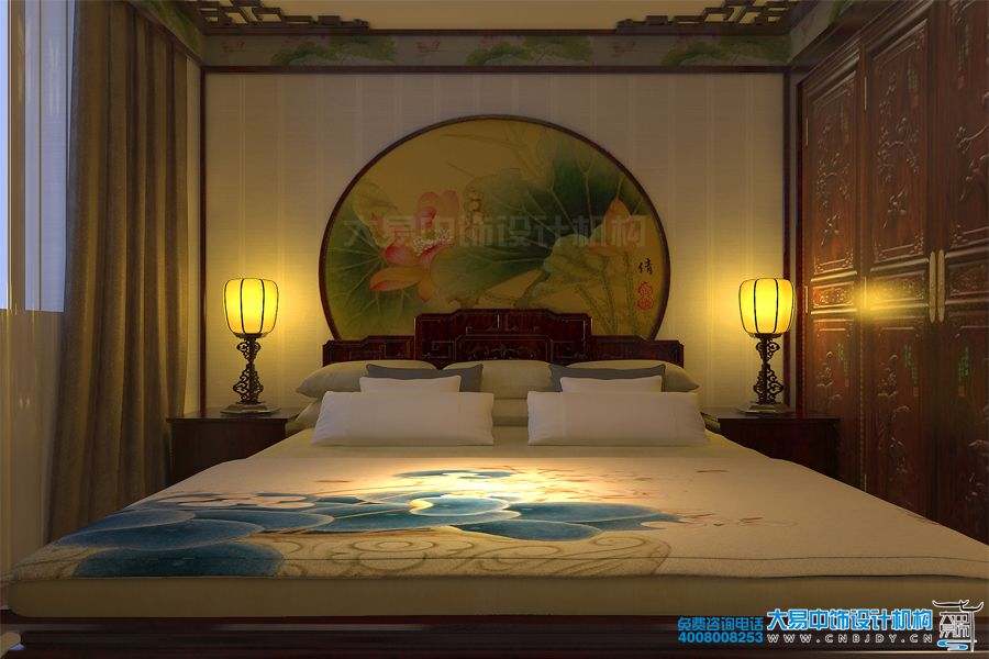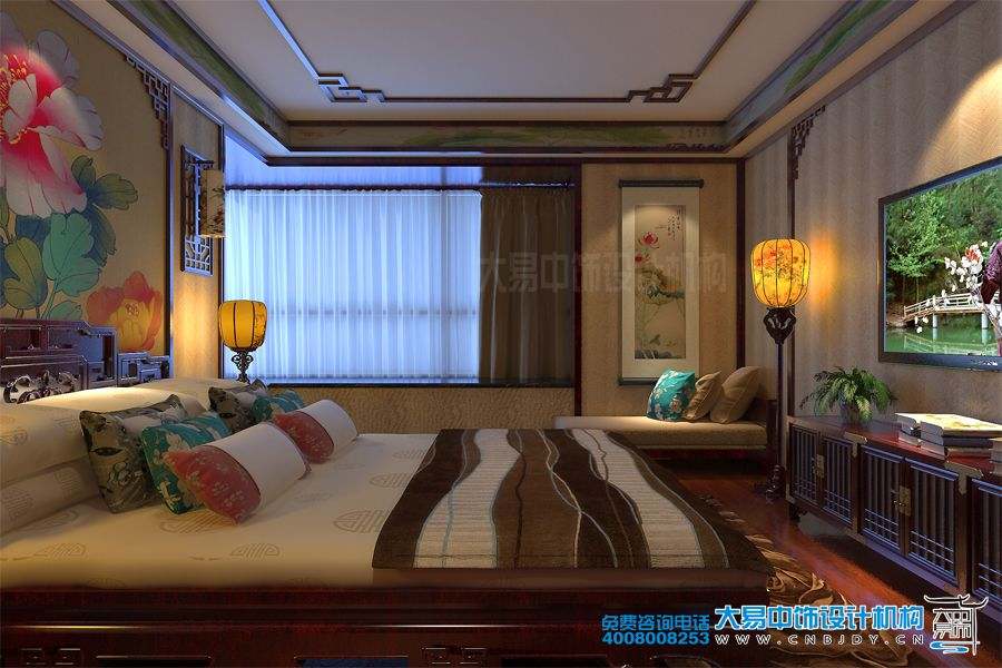 次臥裝修采用了中式風(fēng)格,床頭背景墻上的中國水墨繪畫更是引人注目,表現(xiàn)出一種非凡的中華國畫的藝術(shù)感
