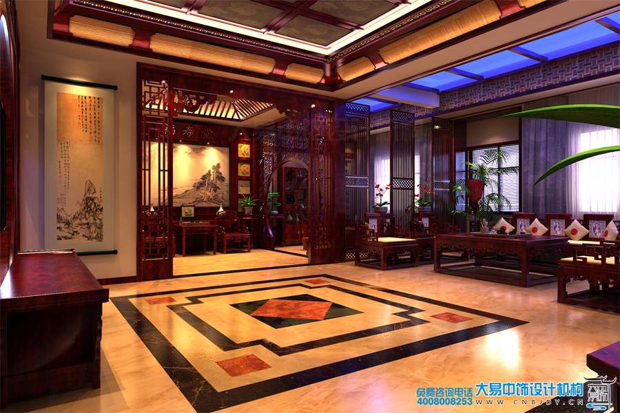 大廳裝飾把傳統的隔斷結構形式通過重新設計,組合為一種嶄新的民族標志符號出現