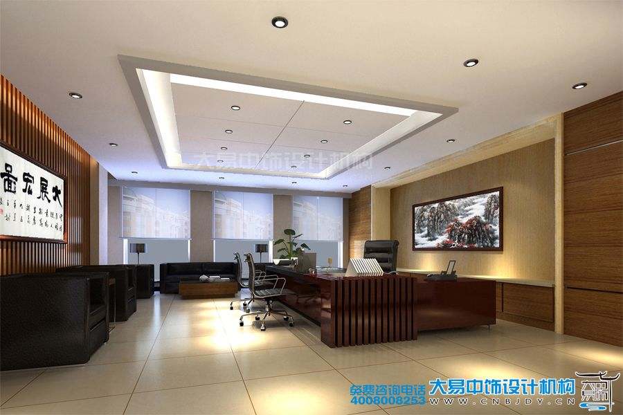 案例賞析:這套現代中式風格的辦公室設計效果圖,首先會讓我們感覺采光條件比較好,因為辦公室之中設計了很大的落地窗,在工作疲勞之時,還能一睹外界世界,緩解視覺疲勞。另外,辦公室裝修上的所有的空間都擁有濃郁的傳統文化的體現。比如,大量實木中式桌椅,古典字畫,加上時尚簡練的現代線條,動感大氣的空間布局,都是現代中式風格辦公室裝修的亮點。在現代社會,若能擁有這樣的辦公空間,會讓我們努力工作的同時,享受清新、舒適的工作環境帶給心情的無比暢快之感。