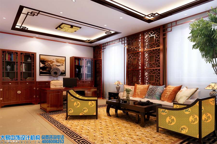 中式辦公室裝修寬敞明亮、大量采用深棕色與淺白色為主色調,凸顯出辦公室莊重大氣的正能量