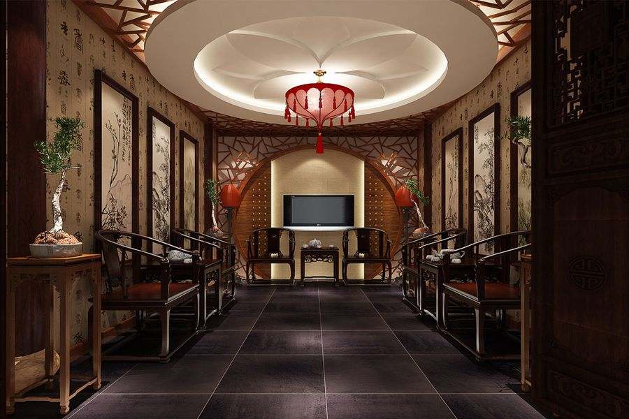 待客廳吊頂別出心裁,花瓣形燈底,流蘇幃邊,紅白相間,煞是動人。正堂設一半開月洞門,竹節宮燈立于兩旁,與吊燈呈同一紅色系。墻面貼古典壁紙,有畫作懸于其上,室內四角皆有木幾承著盆栽,為空間增添別樣生氣。室內巧妙的裝飾與木質座椅的擺設,無一不彰顯貴賓接待室的高貴氣質。