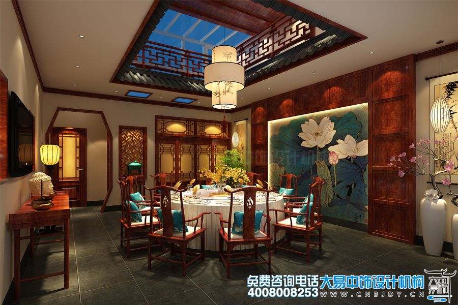 大易中飾在此四合院茶樓中式設計裝修時一改傳統的對稱陳設,八仙桌、中堂、辦公桌、立式書柜以對稱分列,墻面多以畫作增添才情雅韻。木屏將辦公桌與開會區簡單隔開,以木柱石墩頂天立地,,頗具藝術感的根雕吊燈散發出淡淡光影,一盆睡蓮靜靜綻放于此。“一花一世界,一葉一菩提”,蓮心禪韻漸漸暈染開來,彌漫四周。