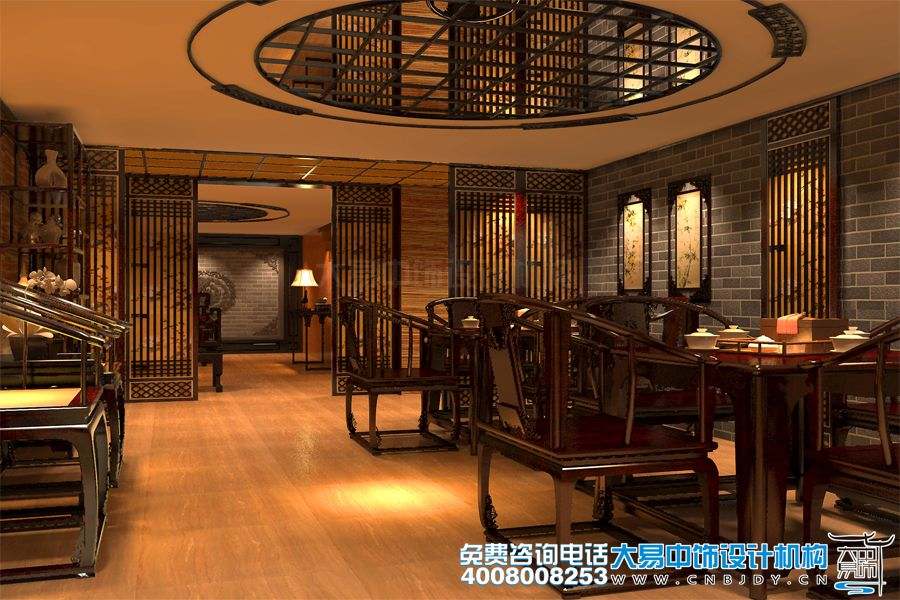 茶樓大廳吊頂用木欄框飾圓形鏡面,映照出空間的祥和溫馨。灰色磚墻古樸自然,掛屏增添幾分人文氣息。門廳隔斷均為軟式木隔,與淺黃色木地板十分相襯。桌椅俱全,做工精細,在燈光的配飾之下尤顯得古色古香。