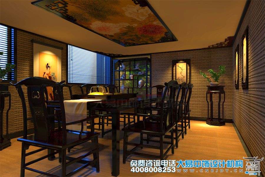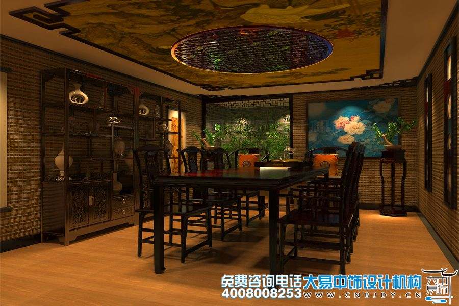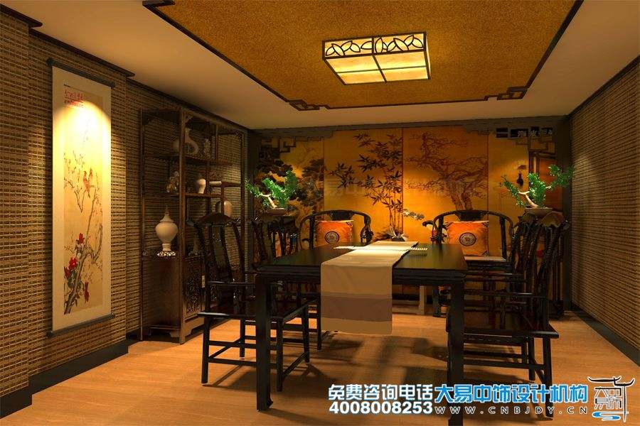 此為大易中飾設計推出的蓮花橋茶樓中式設計裝修案例,主色為灰色、淡黃,以中式壁紙、實木桌椅、書畫、掛屏等為飾,以竹元素為點綴,營造出新中式茶樓的自然清新格調。