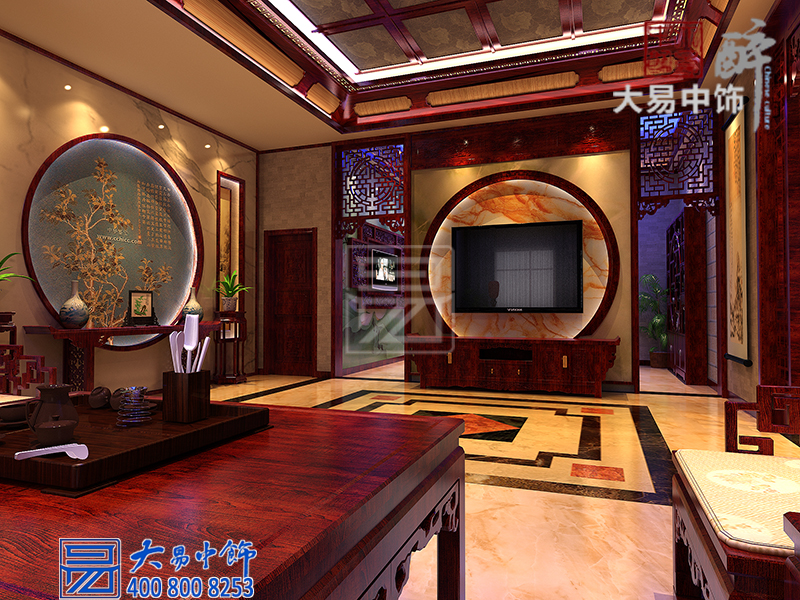 客廳背景墻的裝修采用圓形裝飾,正對應側邊圓形花束圖,實現(xiàn)中式裝修左右對應的布局裝修。