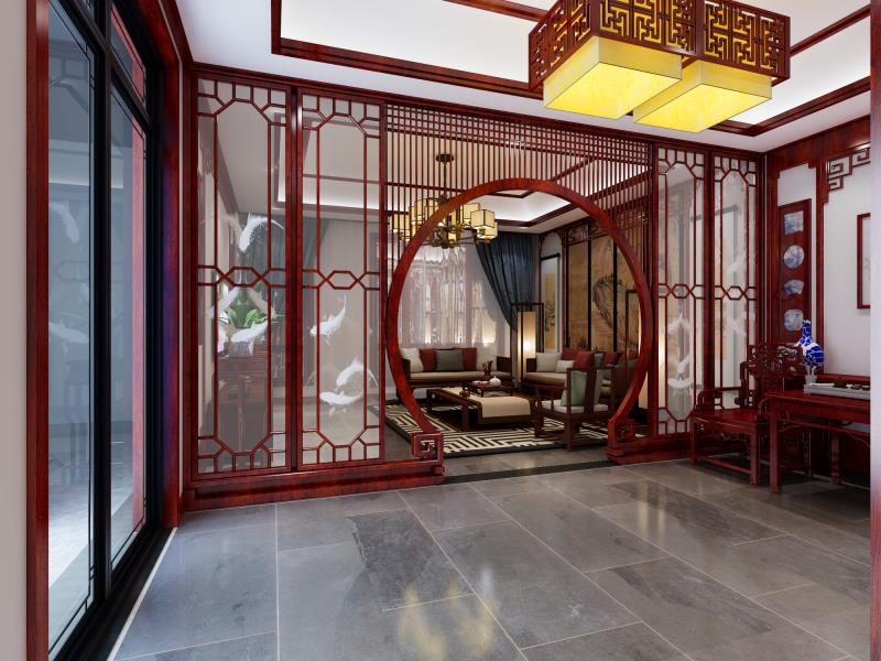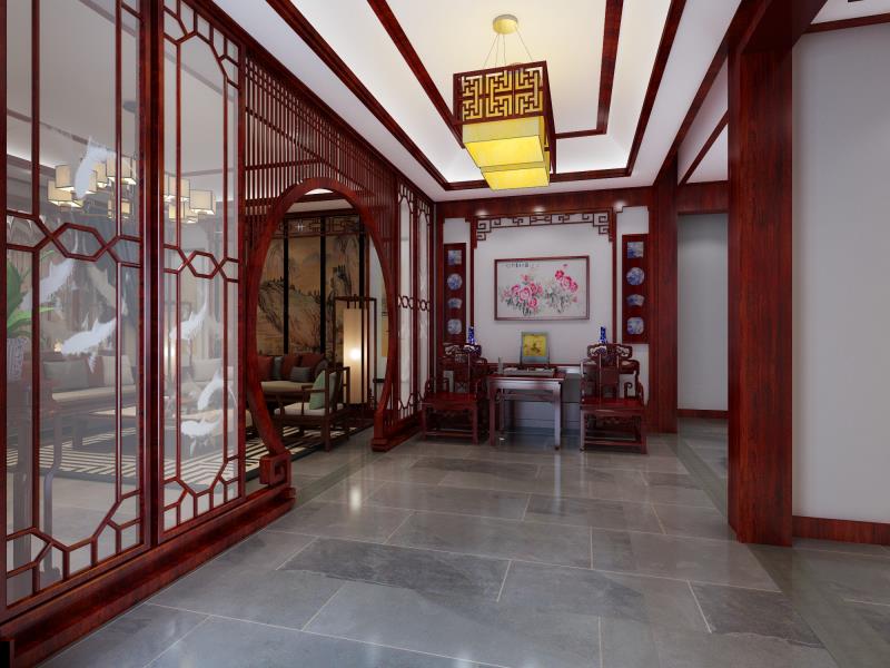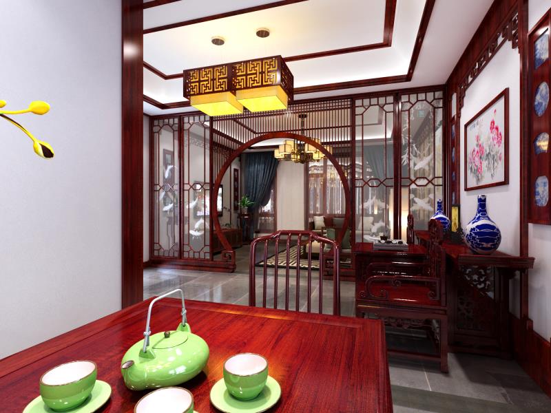 大易中飾負責設計一款四合院裝修客餐廳的中式設計,主要是以實木家具為主,紅色調設計。