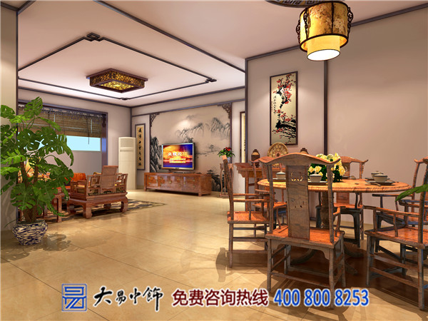 3.沙發(fā)背景墻用具有中國古韻的掛畫點綴,簡潔又大氣,用木質(zhì)鏤空裝飾板,規(guī)劃出餐廳、休息區(qū),變得溫馨、時尚,整套紅木的家具,凸顯了古色古香,使整間客廳看上去顯得優(yōu)雅,又不失古典韻味。
