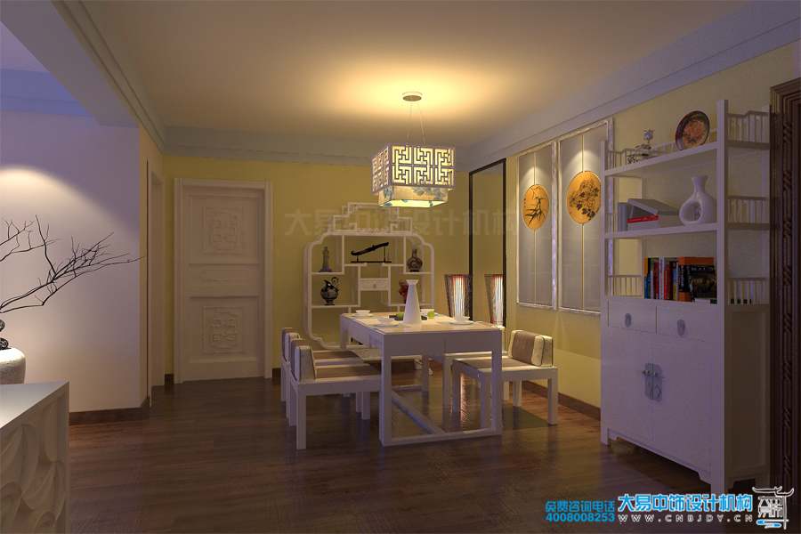 住宅現代中式設計裝修,餐廳設計以白色為主,白色桌椅與原木色地板相搭配,給人以溫暖的質感。簡易博古架豐富著淺黃色的墻面,書柜雙開門上的吉祥扣在細節上透露著設計師的小心思,頗具設計感的座椅靠背,既考慮到居家環境的協調與實用性,又極有美觀度,空間設計使用大面積的留白技法,不僅時尚創意而且意蘊優美。