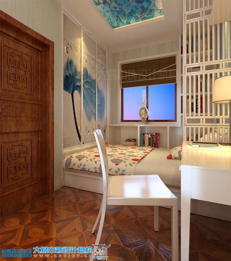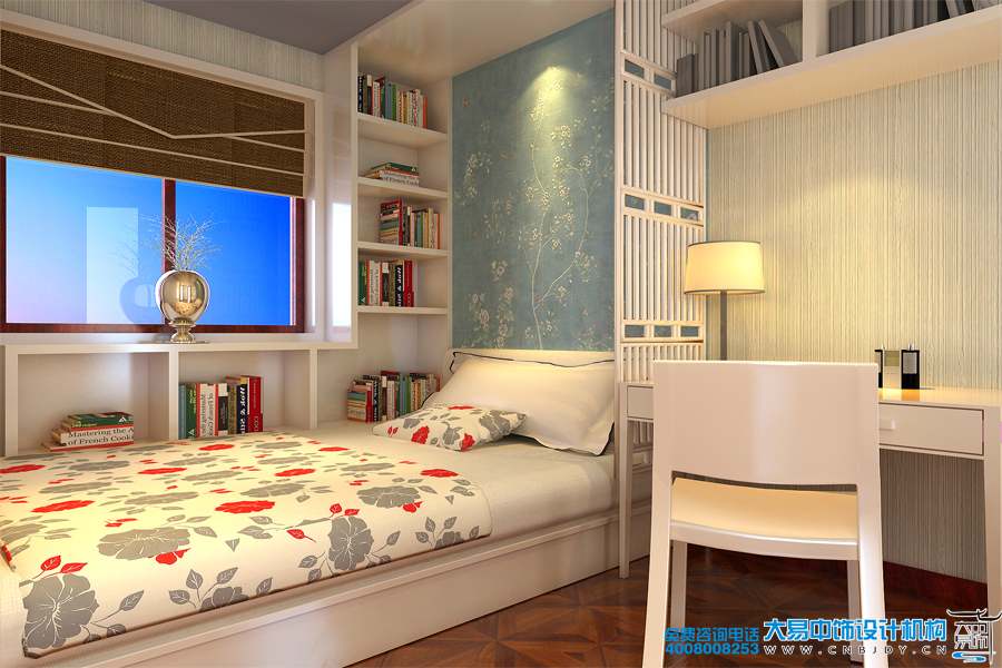 女兒房中式設計裝修,為方便小朋友學習成長,臥室與書房采用一體化設計裝修。嵌入式衣柜,與小床緊緊相連,靠窗設計的書柜給閱讀增加了很多便利,空間主色調以白、藍、原木色為主,自然而充滿朝氣。