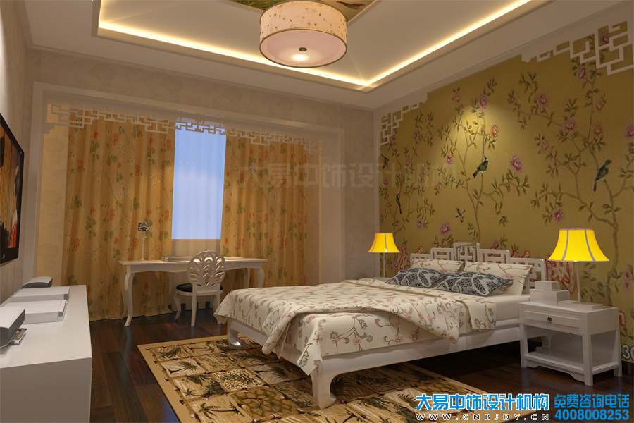 臥室中式設計裝修,空間運用了暖色調的氣息,讓溫馨與浪漫常駐于此。床具背景墻面與窗簾均使用花鳥圖案,營造出一派欣欣向榮的景象。臨窗而設的梳妝臺在陽光中迎來每一個清晨。居室內以白色、米黃色為主要色調,給人以積極向上充滿力量的視覺效果,助眠、充電,給人滿滿的正能量!