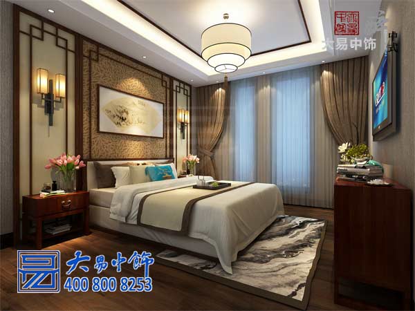 次臥中式裝修在簡約之余更富溫馨,暖色床品、淺褐色窗簾輕吟著詩意的曲調,實木斗柜在電視機下方,隨意擺放一些桌面飾物。床具背景為扇畫,兩側的壁燈散發出昏黃的暖意。
