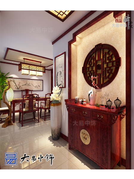 戶型進門處做了改動,增加了一個步入式衣帽間,便于日常生活使用.衣帽間側墻開一圓形景窗設置小條案,形成玄關背景.保證私密的同時又有很好的中式裝飾效果。