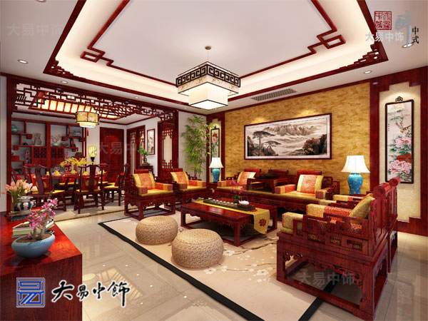客廳中式裝飾通過簡單的吊頂來體現中式氛圍.客廳沙發背景墻采用黃色祥云紋壁紙將紅酸枝家具襯托的更加高貴典雅。